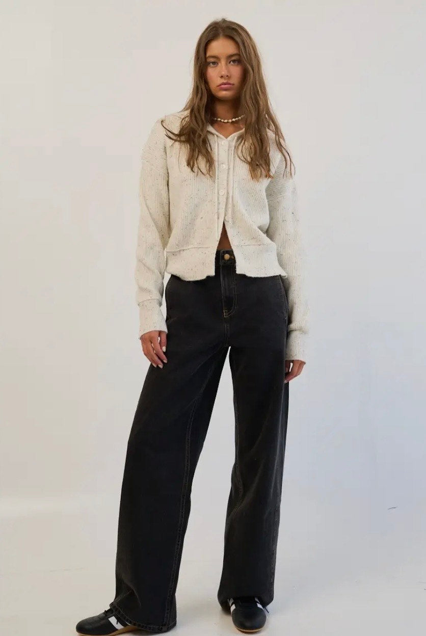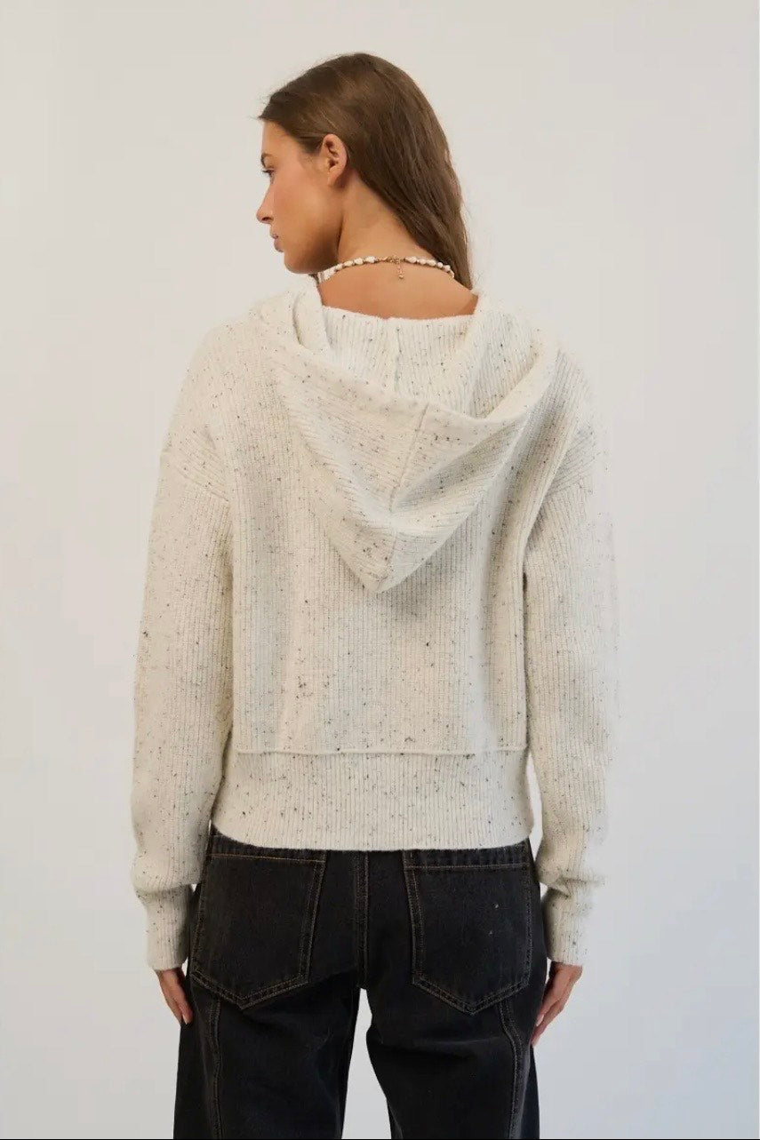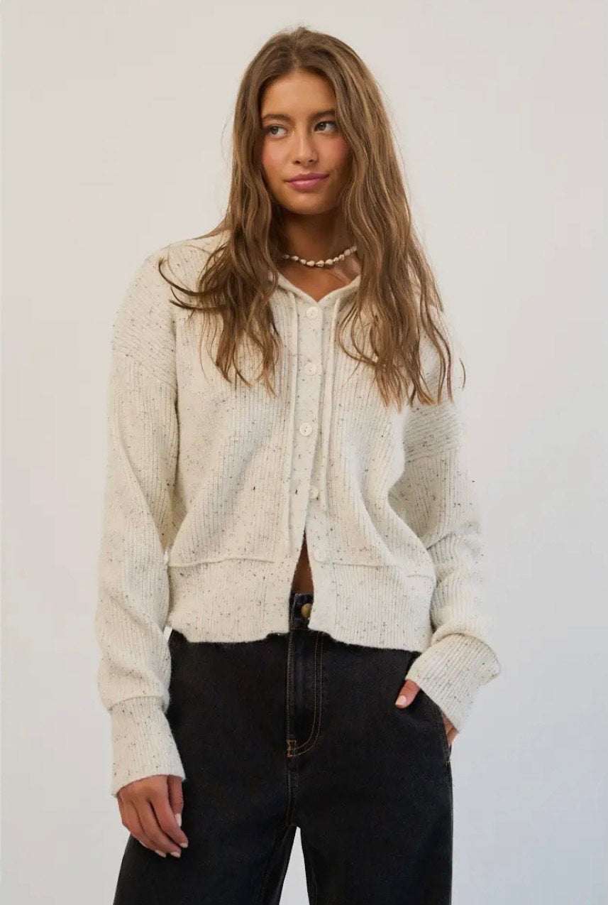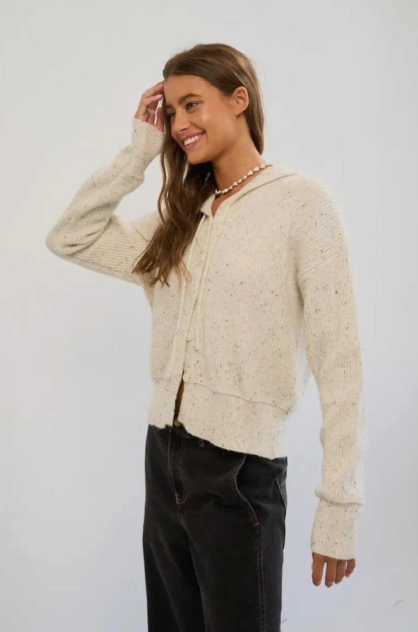 Cozy up in the Chloe speckled knit cardigan featuring a relaxed fit, hoodie detail, and front button closure. Ribbed texture adds dimension while the dropped shoulders and soft blended yarn offer everyday comfort.