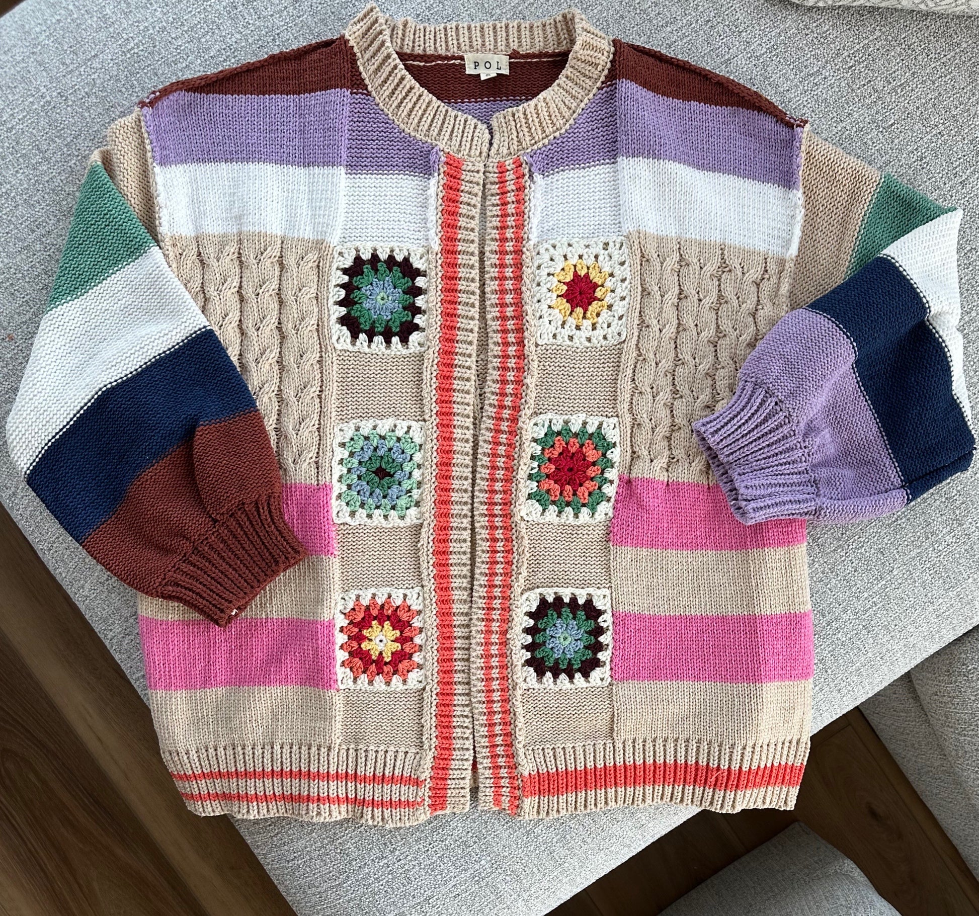 Wrap yourself in the coziness of the Heirloom Cardigan! The crochet squares and mixed patterns are so on trend! Fits true to size, but a relaxed fit.